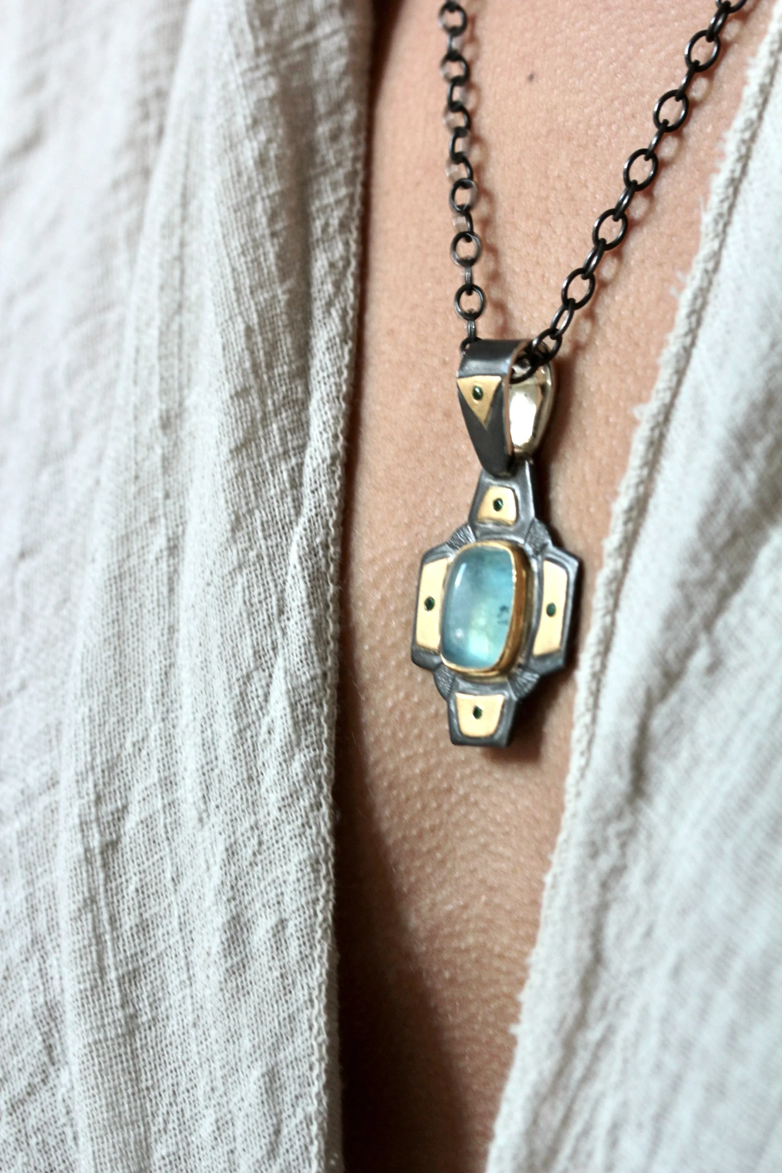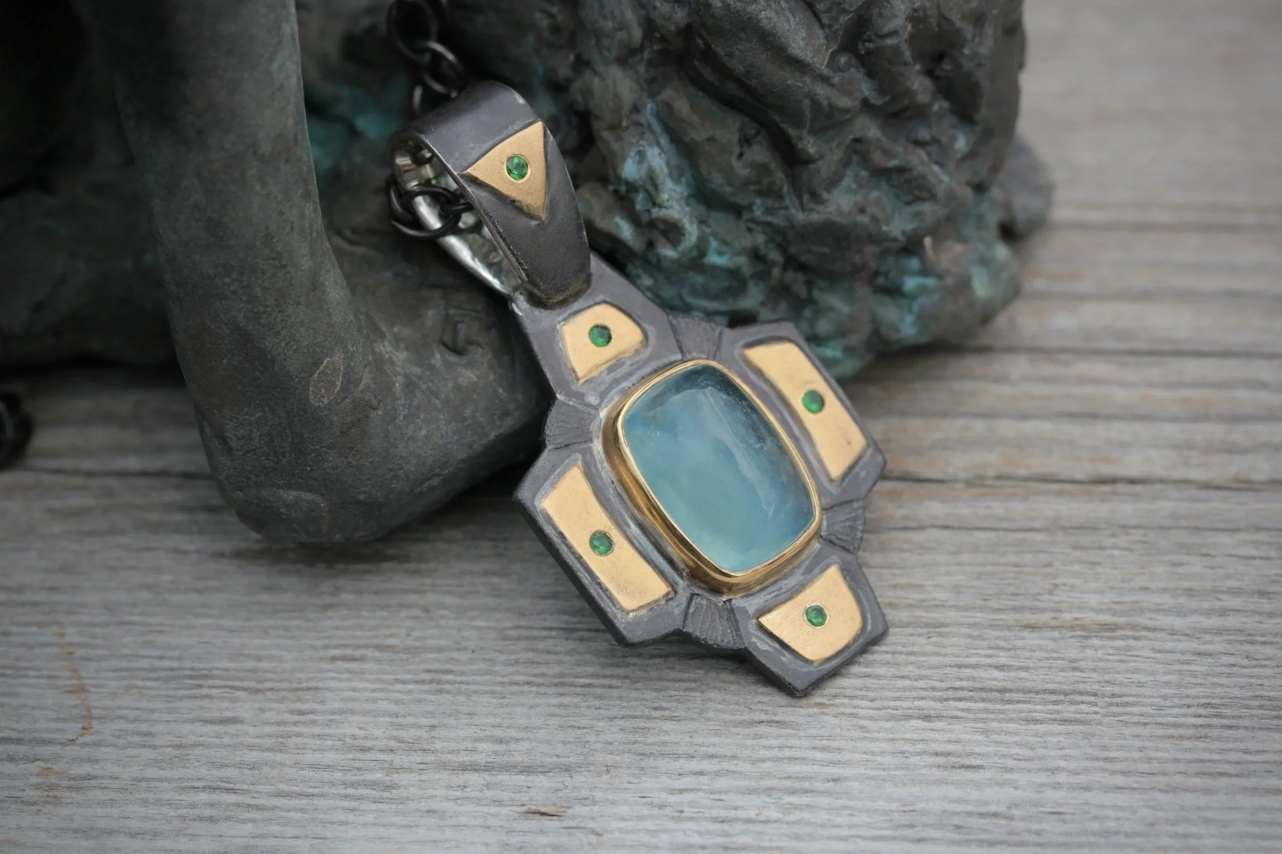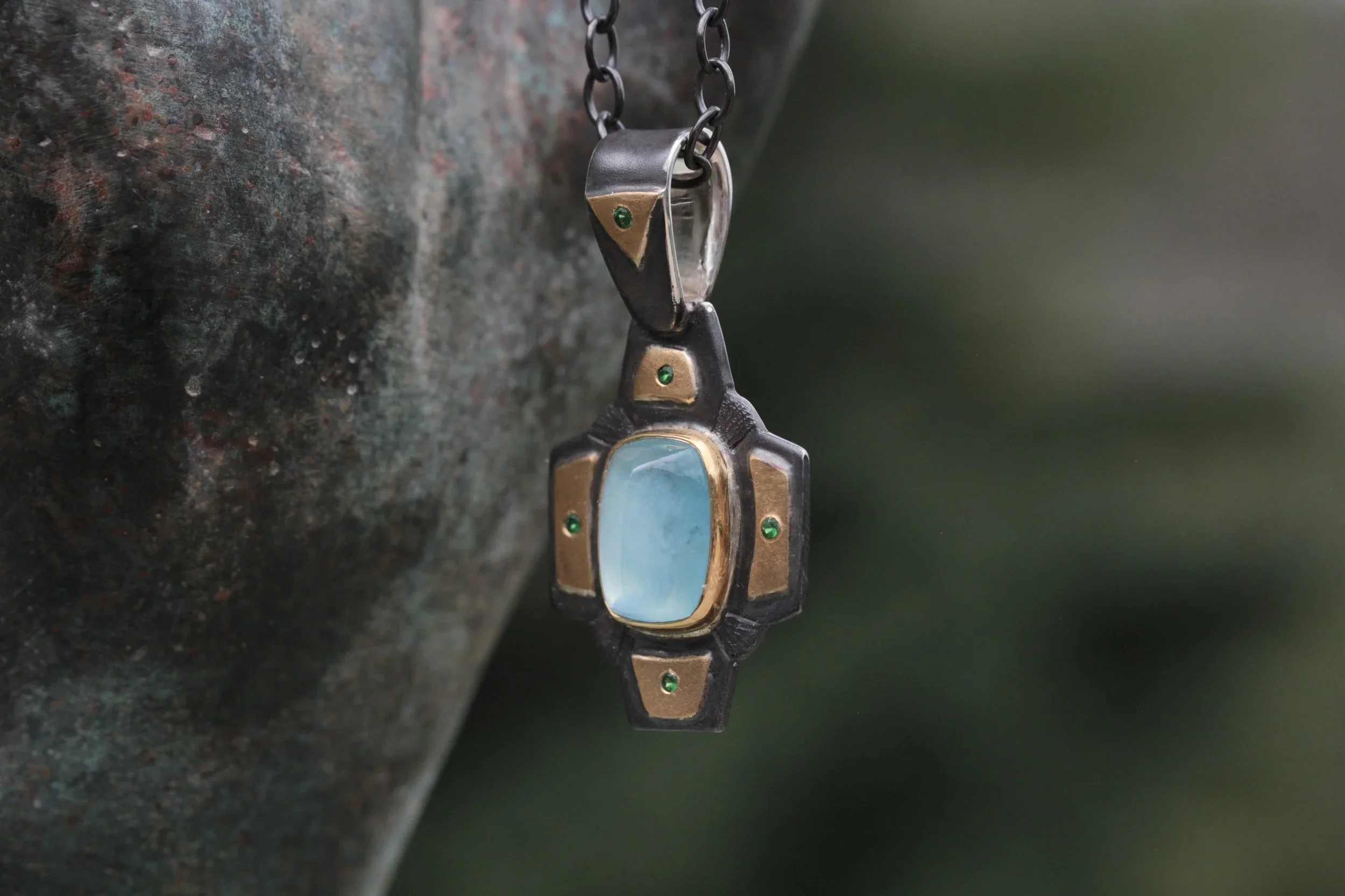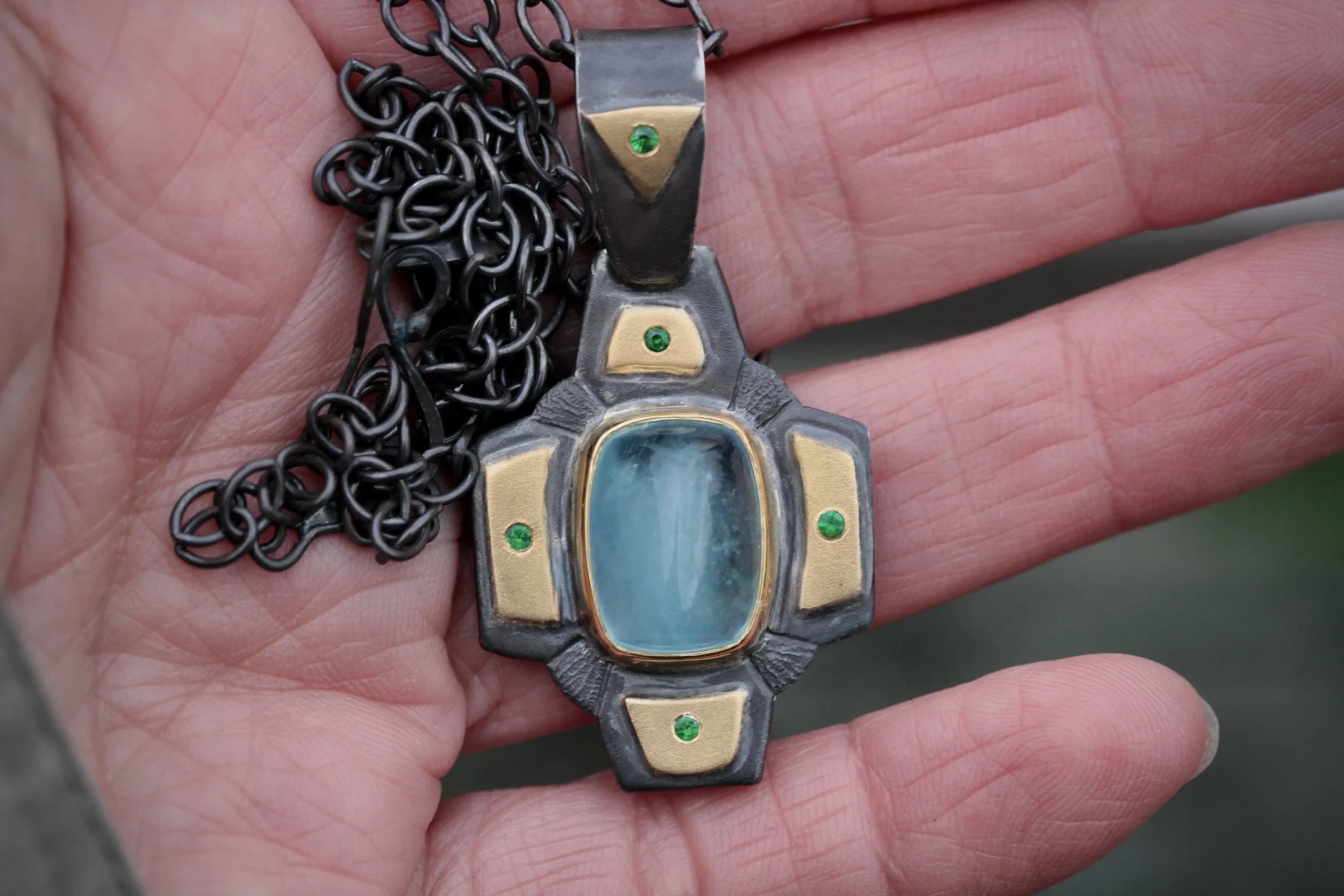 Close-up of a hand wearing a silver and gold ring with a large, oval, blue gemstone.