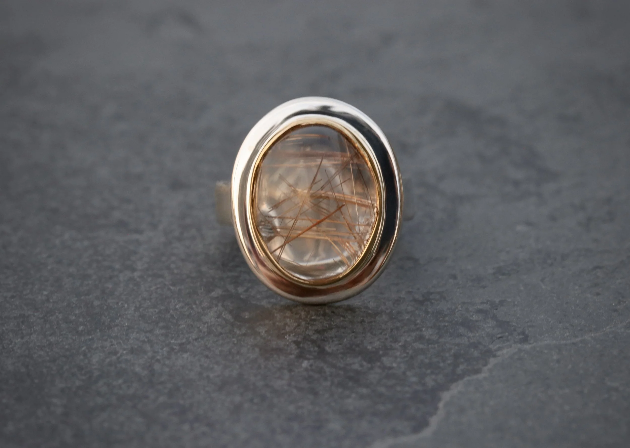 Clean lines and generous proportions git it a grounded, sculptural presence, while the domed stone catches and subtly radiates a deep glow. This ring exudes refined strength, crafted to be worn with confidence and passed down with pride.